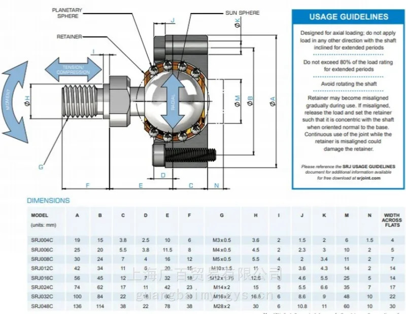例:SRJ012C-P 球頭直徑=12×(1/16*25.4mm)=19.05mm