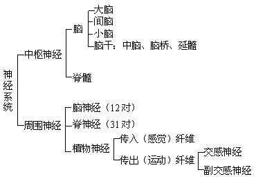 神經(jīng)系統(tǒng)分為中樞神經(jīng)系統(tǒng)和周圍神經(jīng)系統(tǒng)。正如下表所示中樞神經(jīng)系統(tǒng)包括腦和脊髓。后者位于脊柱的椎管內(nèi)。周圍神經(jīng)系包括腦神經(jīng)、脊神經(jīng)和植物神經(jīng)。