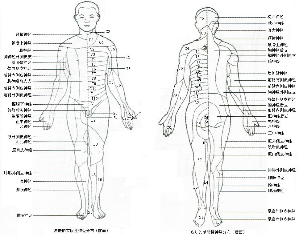 頸叢由頸神經(jīng)1-4的前支構(gòu)成。而胸2-11神經(jīng)構(gòu)成肋間神經(jīng),控制胸部的運(yùn)動(dòng)和感覺功能。臂叢由頸神經(jīng)5-8和胸神經(jīng)1的前支構(gòu)成。腰叢由第12胸神經(jīng)前支的一部分和第1-4腰神經(jīng)構(gòu)成。骶叢由第4腰神經(jīng)、第5腰神經(jīng)和全部骶尾神經(jīng)前支構(gòu)成。其全身皮膚節(jié)段性神經(jīng)分布如圖2-11-1和圖2-11-2所示。第四胸神經(jīng)皮質(zhì),分布與乳頭平面。第十胸神經(jīng)皮質(zhì)分布于臍平面。第十二胸神經(jīng)皮質(zhì)分布于腹股溝上部分。第1-2腰神經(jīng)皮質(zhì)分布于腹股溝分布于腹股溝下部分。四肢皮神經(jīng)大體是沿著身體長(zhǎng)軸,按順序由近及遠(yuǎn)地分布。
