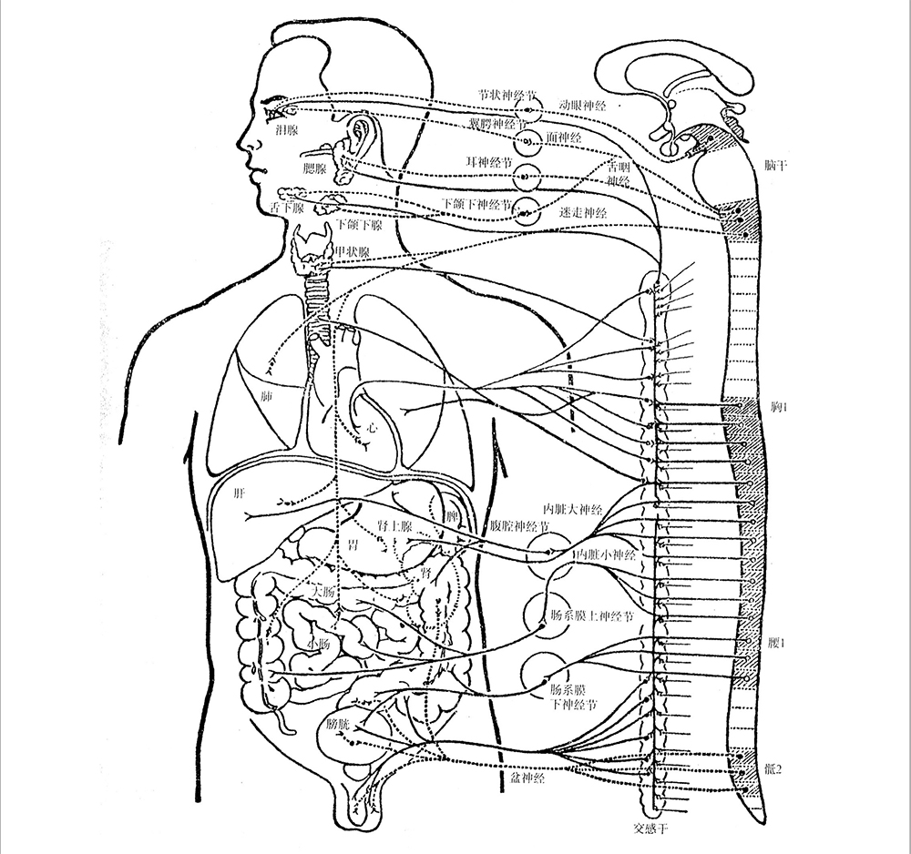 一、植物神經(jīng)分布:交感神經(jīng)分布廣,全身各處都有。副交感神經(jīng)分布范圍有所局限。它們分布到皮膚、血管、汗腺、豎毛肌、內(nèi)分泌器官等。內(nèi)臟運(yùn)動(dòng)神經(jīng)分布到五臟六腑等器官。正如圖2-12所示。