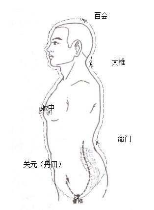 人體奇經(jīng)八脈中,有兩條重要穴位,即任脈和督脈。任脈是陰經(jīng)之海,總管陰脈。督脈為陽經(jīng)之海,總管陽脈。這兩脈在會陰和百會處相交,陰陽貫通,統(tǒng)管全身經(jīng)絡(luò)。“小周天”循環(huán)從任脈上的丹田(相當(dāng)于“關(guān)元穴”)出發(fā),經(jīng)督脈達(dá)到百會,然后經(jīng)任脈回到丹田。從而反復(fù)循環(huán),這種循環(huán)稱之為“小周天”,與字面意義一樣,如同天上的“氣”在人體小范圍內(nèi)反復(fù)循環(huán)。(如圖2-3)?!靶≈芴臁毖h(huán)使人體陰陽平衡,并陰陽經(jīng)氣血貫通,保證機(jī)體健康不生病。否則,機(jī)體衰弱會生病。(如圖2-3)