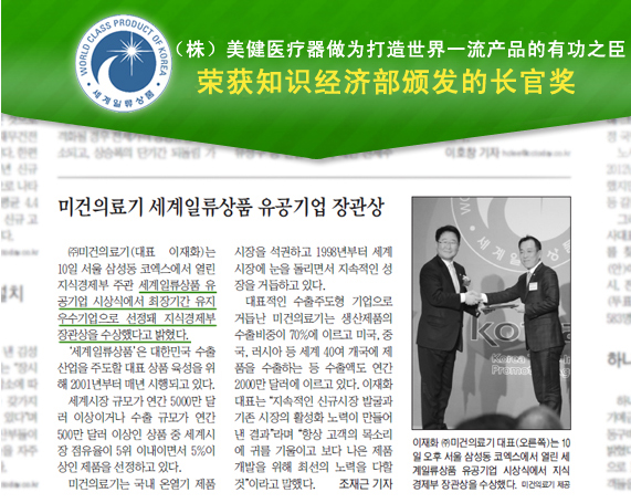 (株)美健醫(yī)療器代表理事李栽和于2012年12月10日在首爾三省洞Coex由知識(shí)經(jīng)濟(jì)部主辦的世界一流產(chǎn)品有功企業(yè)頒獎(jiǎng)儀式中被評(píng)選為長(zhǎng)期保持世界一流產(chǎn)品的優(yōu)秀企業(yè),并榮獲知識(shí)經(jīng)濟(jì)部頒發(fā)的長(zhǎng)官獎(jiǎng)。