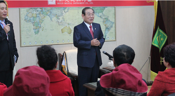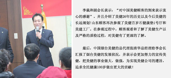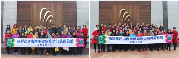 2013年11月8日,山東煙臺總代理張清華總經(jīng)理攜上百名美健家族成員訪問了韓國美健總部,李相福會長及李栽和副會長做了親切接見。 在接待大廳,李會長表示:“能在此和中國山東地區(qū)優(yōu)秀的顧客見面感到非常高興,由于目前山東地區(qū)顧客不斷增多,會盡快安排訪問山東地區(qū),并且和更多的顧客見面?!?